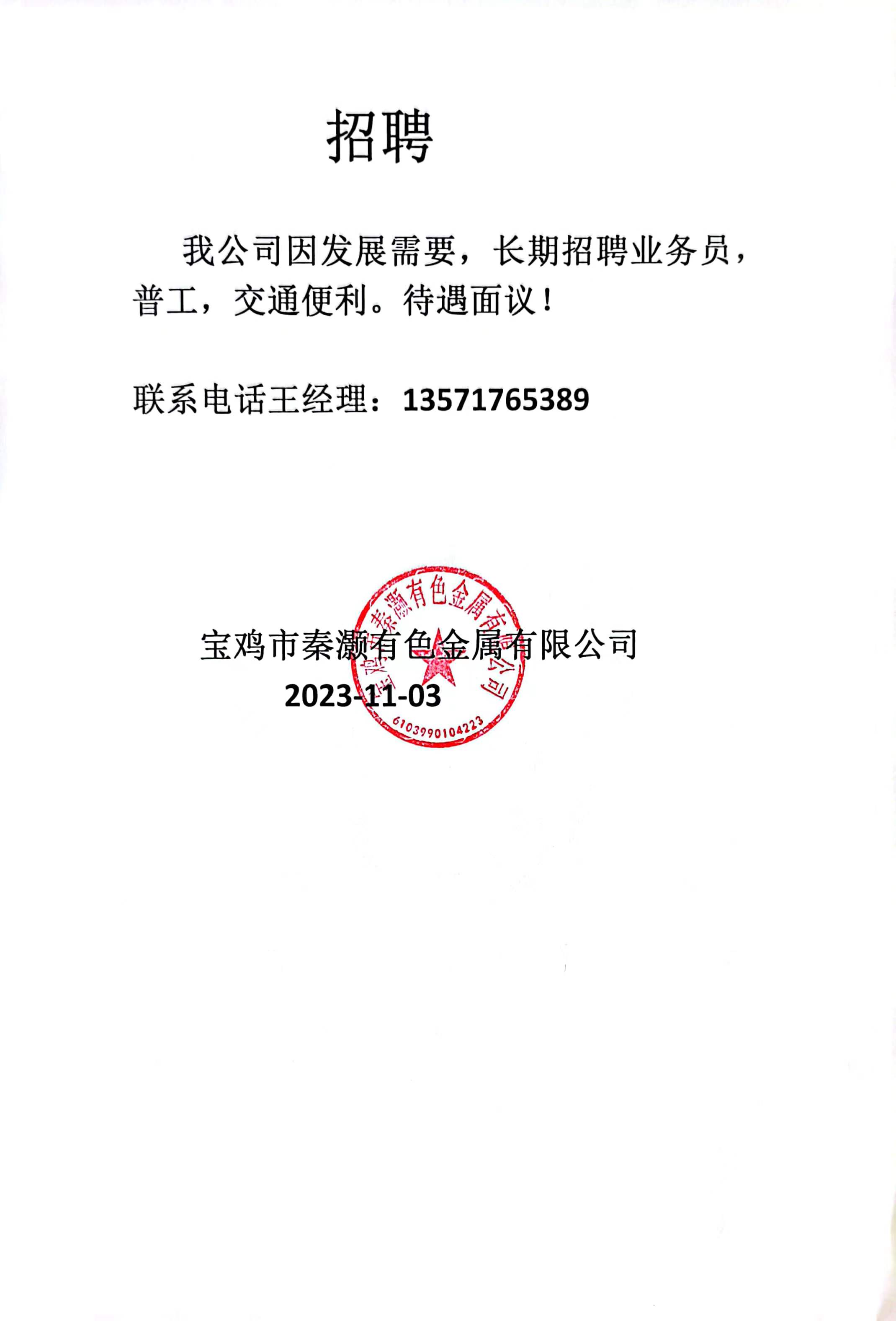 招聘 因公司發(fā)展需要,長期招聘業(yè)務(wù),普工,交通便利! 待遇面議! 聯(lián)系電話王經(jīng)理:13571765389 |
